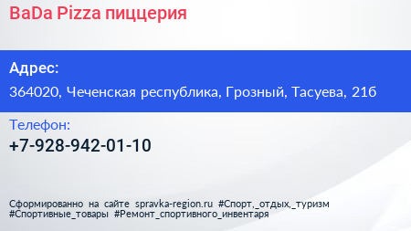 BaDa Pizza, пиццерия по адресу 364020, Чеченская республика, Грозный, Тасуева, 21б в дальнейшем Организация, размещена в следующих категориях: