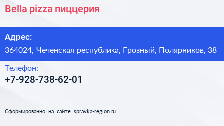 Bella pizza, пиццерия по адресу 364024, Чеченская республика, Грозный, Полярников, 38 в дальнейшем Организация, размещена в следующих категориях: