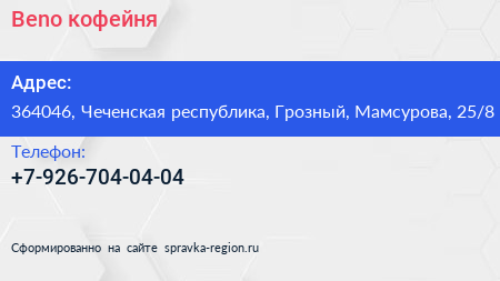 Beno, кофейня по адресу 364046, Чеченская республика, Грозный, Мамсурова, 25/8 в дальнейшем Организация, размещена в следующих категориях: