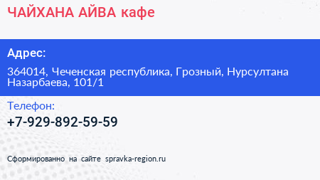 ЧАЙХАНА АЙВА, кафе по адресу 364014, Чеченская республика, Грозный, Нурсултана Назарбаева, 101/1 в дальнейшем Организация, размещена в следующих категориях: