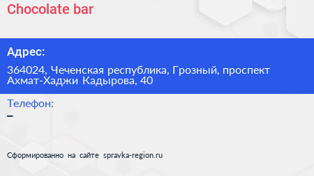 Chocolate bar по адресу 364024, Чеченская республика, Грозный, проспект Ахмат-Хаджи Кадырова, 40 в дальнейшем Организация, размещена в следующих категориях: