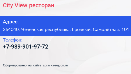 City View, ресторан по адресу 364040, Чеченская республика, Грозный, Самолётная, 101 в дальнейшем Организация, размещена в следующих категориях: