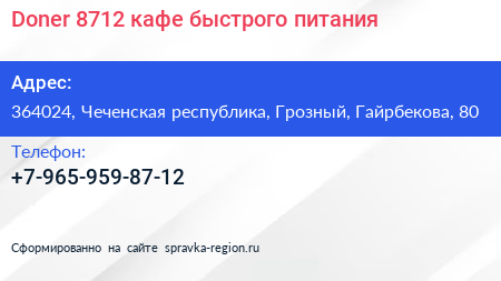 Doner 8712, кафе быстрого питания по адресу 364024, Чеченская республика, Грозный, Гайрбекова, 80 в дальнейшем Организация, размещена в следующих категориях: