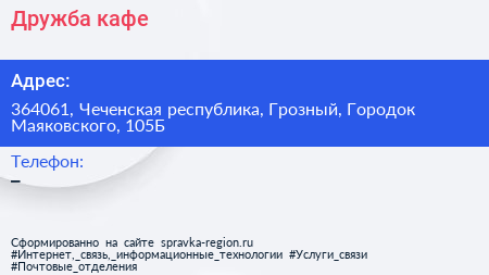 Дружба, кафе по адресу 364061, Чеченская республика, Грозный, Городок Маяковского, 105Б в дальнейшем Организация, размещена в следующих категориях: