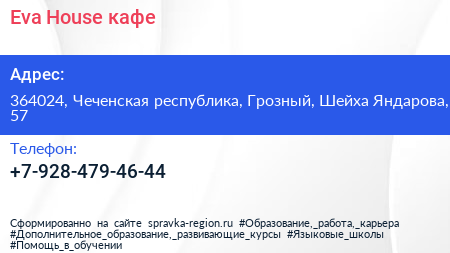 Eva-House, кафе по адресу 364024, Чеченская республика, Грозный, Шейха Яндарова, 57 в дальнейшем Организация, размещена в следующих категориях: