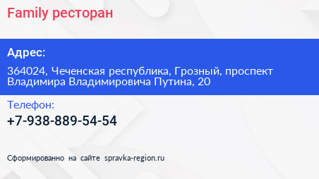 Family, ресторан по адресу 364024, Чеченская республика, Грозный, проспект Владимира Владимировича Путина, 20 в дальнейшем Организация, размещена в следующих категориях: