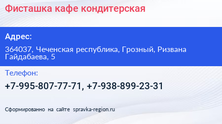 Фисташка, кафе-кондитерская по адресу 364037, Чеченская республика, Грозный, Ризвана Гайдабаева, 5 в дальнейшем Организация, размещена в следующих категориях: