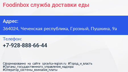 Foodinbox, служба доставки еды по адресу 364024, Чеченская республика, Грозный, Пушкина, 9а в дальнейшем Организация, размещена в следующих категориях: