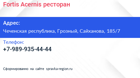 Fortis Acernis, ресторан по адресу Чеченская республика, Грозный, Сайханова, 185/7 в дальнейшем Организация, размещена в следующих категориях: