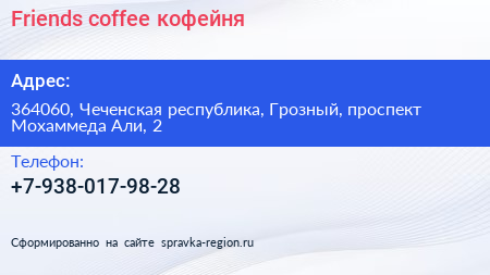 Friends coffee, кофейня по адресу 364060, Чеченская республика, Грозный, проспект Мохаммеда Али, 2 в дальнейшем Организация, размещена в следующих категориях: