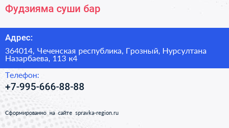 Фудзияма, суши-бар по адресу 364014, Чеченская республика, Грозный, Нурсултана Назарбаева, 113 к4 в дальнейшем Организация, размещена в следующих категориях:
