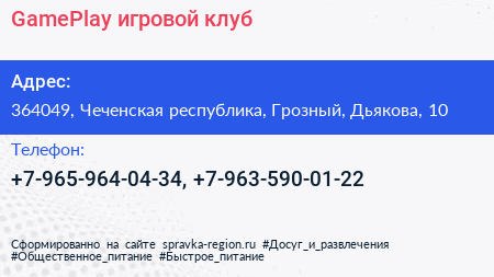 GamePlay, игровой клуб по адресу 364049, Чеченская республика, Грозный, Дьякова, 10 в дальнейшем Организация, размещена в следующих категориях: