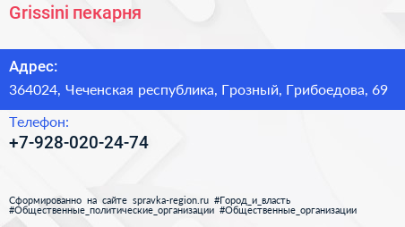 Grissini, пекарня по адресу 364024, Чеченская республика, Грозный, Грибоедова, 69 в дальнейшем Организация, размещена в следующих категориях: