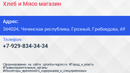 Хлеб и Мясо, магазин по адресу 364024, Чеченская республика, Грозный, Грибоедова, 69 в дальнейшем Организация, размещена в следующих категориях: