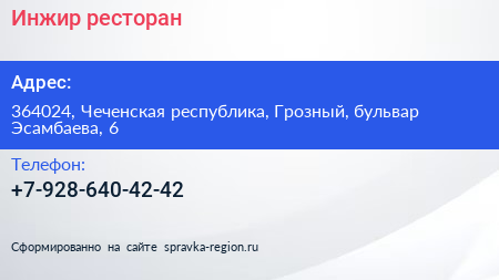 Инжир, ресторан по адресу 364024, Чеченская республика, Грозный, бульвар Эсамбаева, 6 в дальнейшем Организация, размещена в следующих категориях: