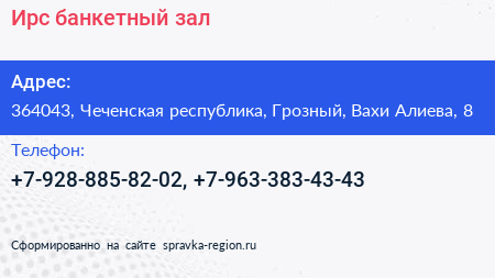 Ирс, банкетный зал по адресу 364043, Чеченская республика, Грозный, Вахи Алиева, 8 в дальнейшем Организация, размещена в следующих категориях: