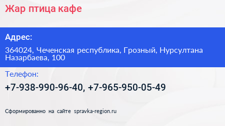 Жар птица, кафе по адресу 364024, Чеченская республика, Грозный, Нурсултана Назарбаева, 100 в дальнейшем Организация, размещена в следующих категориях: