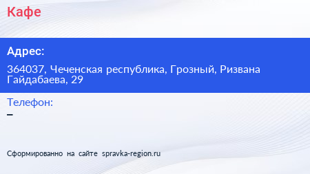 Кафе по адресу 364037, Чеченская республика, Грозный, Ризвана Гайдабаева, 29 в дальнейшем Организация, размещена в следующих категориях: