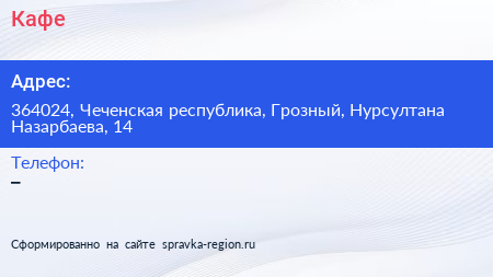 Кафе по адресу 364024, Чеченская республика, Грозный, Нурсултана Назарбаева, 14 в дальнейшем Организация, размещена в следующих категориях: