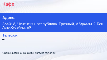 Кафе по адресу 364016, Чеченская республика, Грозный, Абдаллы 2 Бен Аль-Хусейна, 69 в дальнейшем Организация, размещена в следующих категориях:
