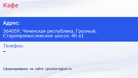 Кафе по адресу 364059, Чеченская республика, Грозный, Старопромысловское шоссе, 40 к1 в дальнейшем Организация, размещена в следующих категориях: