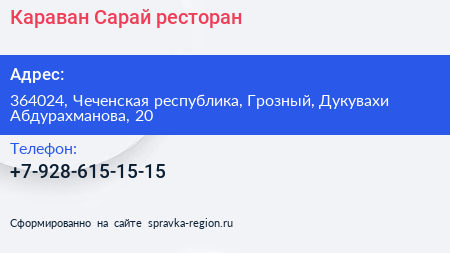 Караван-Сарай, ресторан по адресу 364024, Чеченская республика, Грозный, Дукувахи Абдурахманова, 20 в дальнейшем Организация, размещена в следующих категориях:
