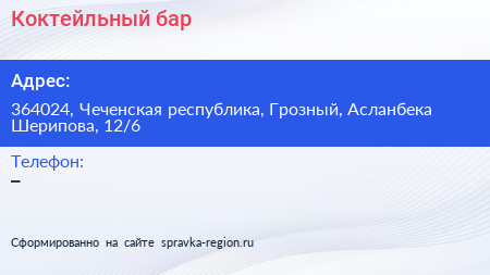 Коктейльный бар по адресу 364024, Чеченская республика, Грозный, Асланбека Шерипова, 12/6 в дальнейшем Организация, размещена в следующих категориях: