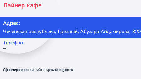 Лайнер, кафе по адресу Чеченская республика, Грозный, Абузара Айдамирова, 320 в дальнейшем Организация, размещена в следующих категориях: