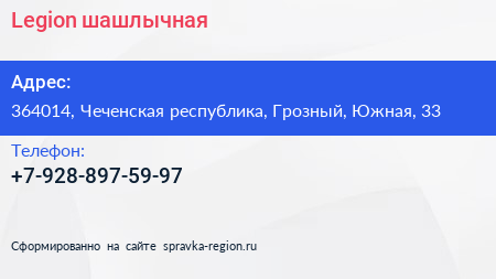 Legion, шашлычная по адресу 364014, Чеченская республика, Грозный, Южная, 33 в дальнейшем Организация, размещена в следующих категориях: