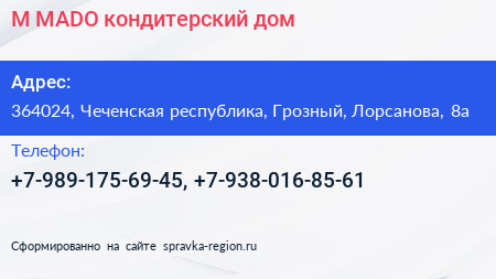 M`MADO, кондитерский дом по адресу 364024, Чеченская республика, Грозный, Лорсанова, 8а в дальнейшем Организация, размещена в следующих категориях: