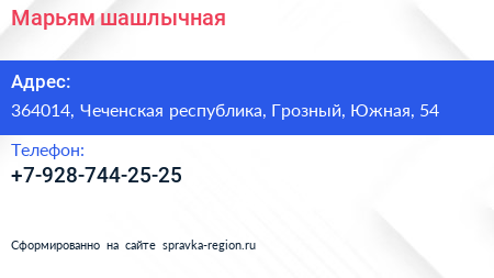 Марьям, шашлычная по адресу 364014, Чеченская республика, Грозный, Южная, 54 в дальнейшем Организация, размещена в следующих категориях: