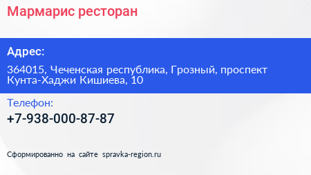 Мармарис, ресторан по адресу 364015, Чеченская республика, Грозный, проспект Кунта-Хаджи Кишиева, 10 в дальнейшем Организация, размещена в следующих категориях: