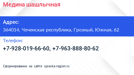 Медина, шашлычная по адресу 364014, Чеченская республика, Грозный, Южная, 62 в дальнейшем Организация, размещена в следующих категориях: