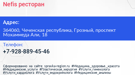 Nefis, ресторан по адресу 364060, Чеченская республика, Грозный, проспект Мохаммеда Али, 18 в дальнейшем Организация, размещена в следующих категориях: