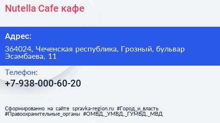Nutella Cafe, кафе по адресу 364024, Чеченская республика, Грозный, бульвар Эсамбаева, 11 в дальнейшем Организация, размещена в следующих категориях: