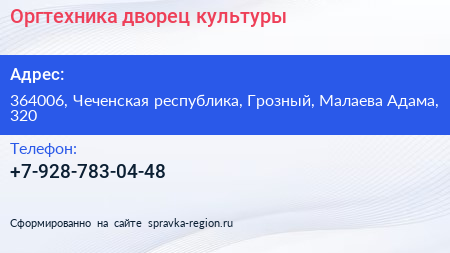 Оргтехника, дворец культуры по адресу 364006, Чеченская республика, Грозный, Малаева Адама, 320 в дальнейшем Организация, размещена в следующих категориях: