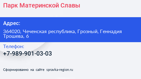 Парк Материнской Славы по адресу 364020, Чеченская республика, Грозный, Геннадия Трошева, 6 в дальнейшем Организация, размещена в следующих категориях: