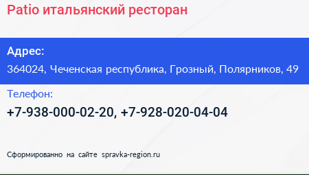 Patio, итальянский ресторан по адресу 364024, Чеченская республика, Грозный, Полярников, 49 в дальнейшем Организация, размещена в следующих категориях: