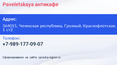 Paveletskaya, антикафе по адресу 364015, Чеченская республика, Грозный, Краснофлотская, 1 ст2 в дальнейшем Организация, размещена в следующих категориях:
