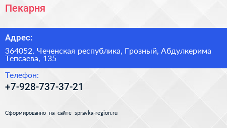 Пекарня по адресу 364052, Чеченская республика, Грозный, Абдулкерима Тепсаева, 135 в дальнейшем Организация, размещена в следующих категориях: