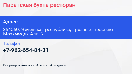 Пиратская бухта, ресторан по адресу 364060, Чеченская республика, Грозный, проспект Мохаммеда Али, 2 в дальнейшем Организация, размещена в следующих категориях:
