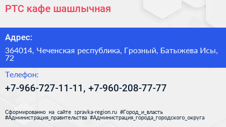 РТС, кафе-шашлычная по адресу 364014, Чеченская республика, Грозный, Батыжева Исы, 72 в дальнейшем Организация, размещена в следующих категориях: