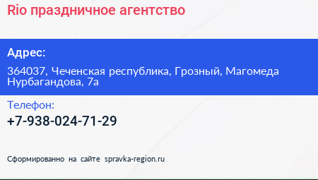 Rio, праздничное агентство по адресу 364037, Чеченская республика, Грозный, Магомеда Нурбагандова, 7а в дальнейшем Организация, размещена в следующих категориях: