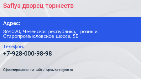 Safiya, дворец торжеств по адресу 364020, Чеченская республика, Грозный, Старопромысловское шоссе, 5Б в дальнейшем Организация, размещена в следующих категориях: