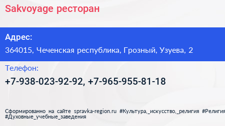 Sakvoyage, ресторан по адресу 364015, Чеченская республика, Грозный, Узуева, 2 в дальнейшем Организация, размещена в следующих категориях: