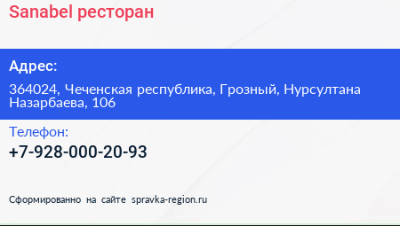 Sanabel, ресторан по адресу 364024, Чеченская республика, Грозный, Нурсултана Назарбаева, 106 в дальнейшем Организация, размещена в следующих категориях: