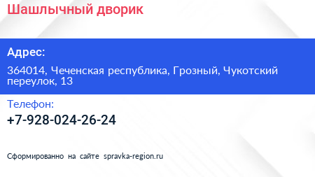Шашлычный дворик по адресу 364014, Чеченская республика, Грозный, Чукотский переулок, 13 в дальнейшем Организация, размещена в следующих категориях: