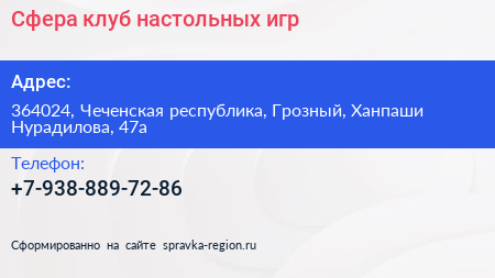 Сфера, клуб настольных игр по адресу 364024, Чеченская республика, Грозный, Ханпаши Нурадилова, 47а в дальнейшем Организация, размещена в следующих категориях: