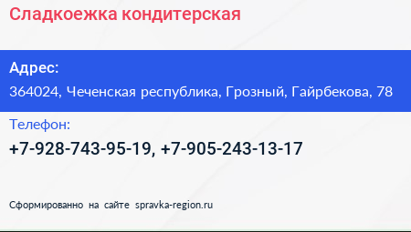 Сладкоежка, кондитерская по адресу 364024, Чеченская республика, Грозный, Гайрбекова, 78 в дальнейшем Организация, размещена в следующих категориях: