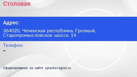 Столовая по адресу 364020, Чеченская республика, Грозный, Старопромысловское шоссе, 14 в дальнейшем Организация, размещена в следующих категориях: